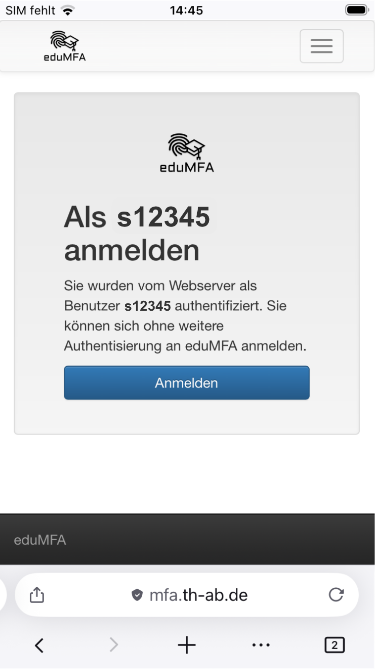 Nach der bekannten Shibboleth-Anmeldung mit Login und Passwort können Sie sich mit Ihrer Hochschulkennung bei eduMFA anmelden: