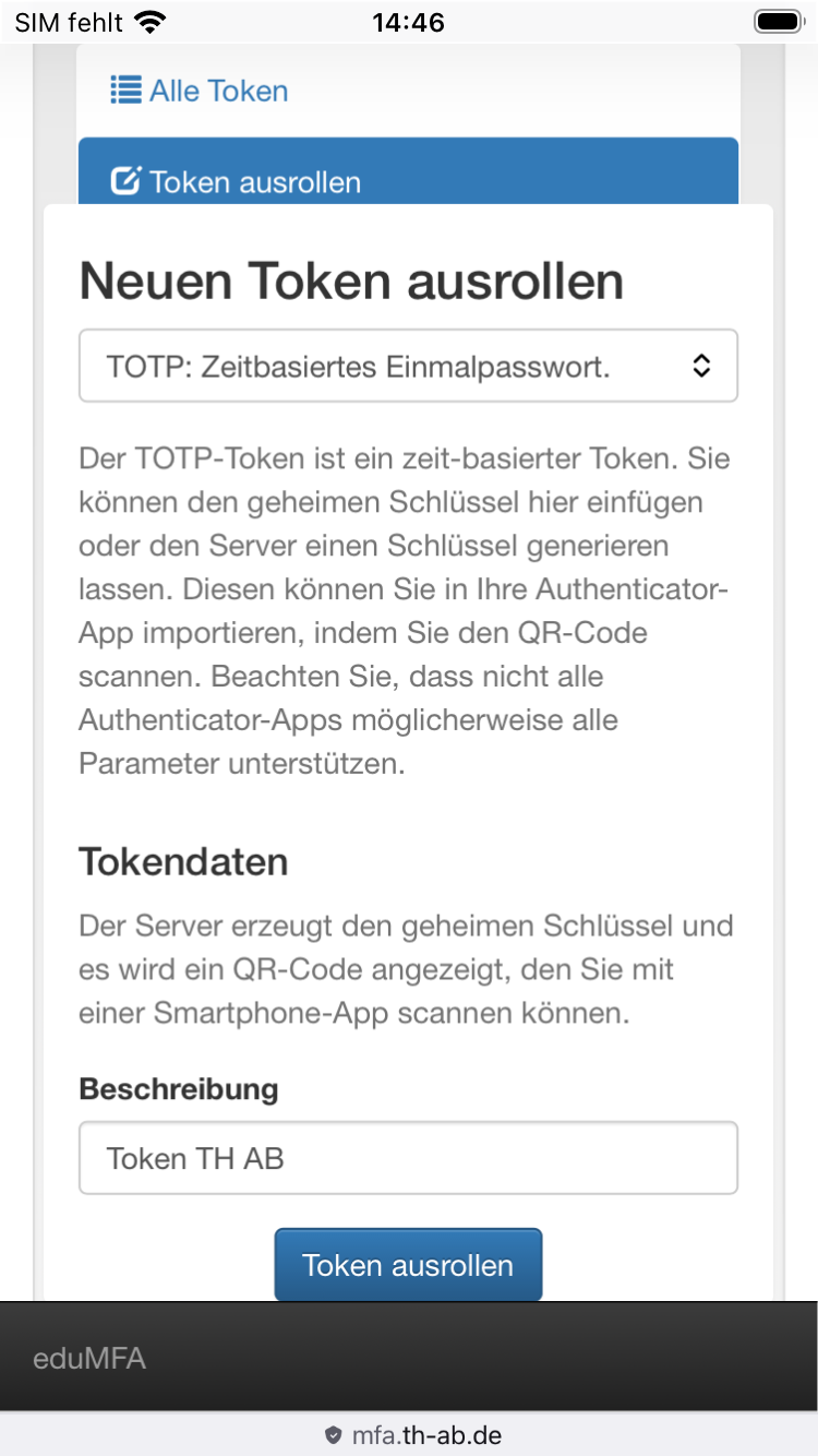 Nach einem Klick auf den Button "Token Ausrollen" gelangen Sie zum nächsten Schritt.