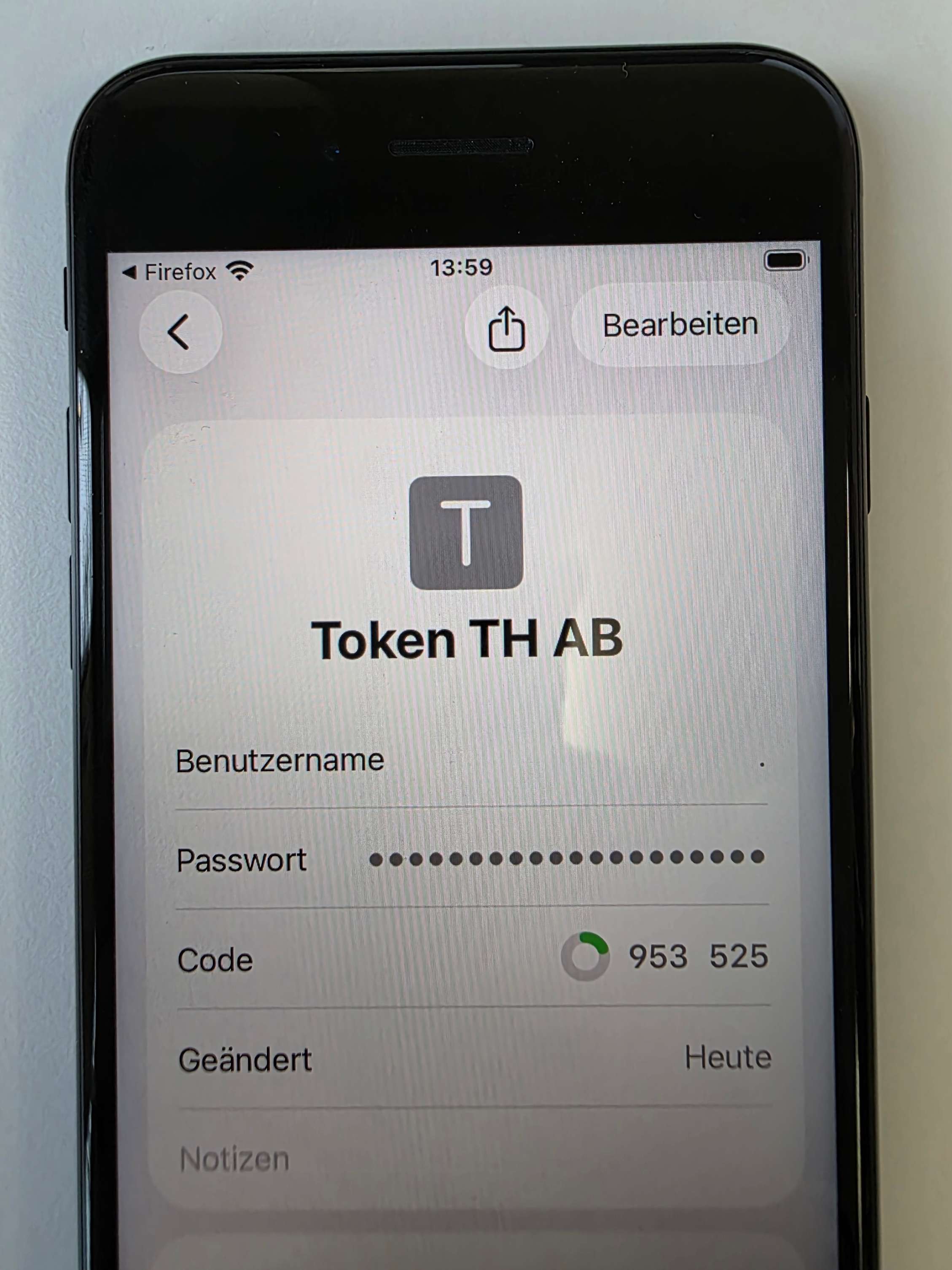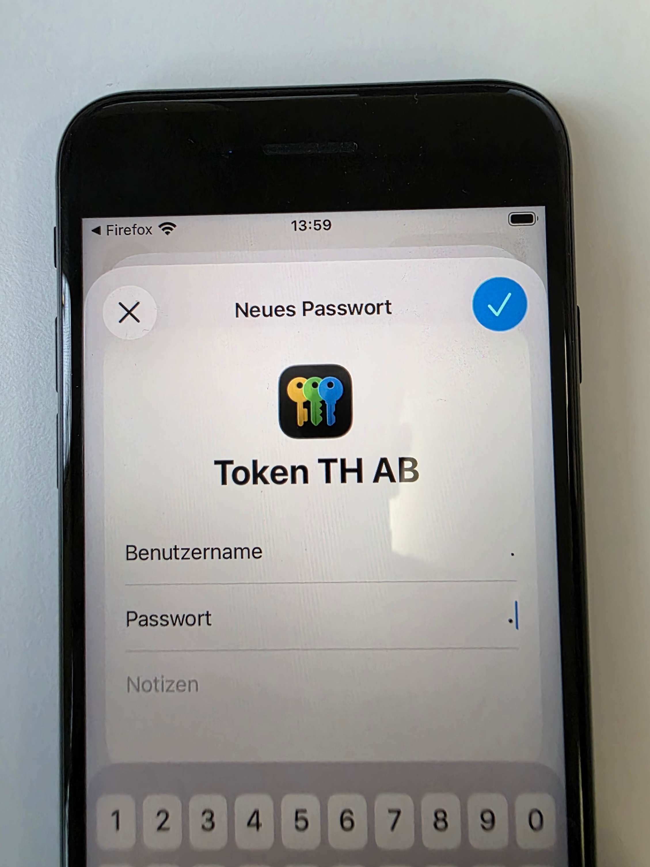 Jetzt kann man dort wo "Token TH AB" steht einen beliebigen Namen vergeben wie der TOTP heißen soll. Bei Benutzername und Passwort spielt es keine Rolle was man eingibt, man kann wie auf dem Bild einfach jeweils einen Punkt eingeben. Zum Schluss rechts oben auf den Haken tippen um den TOTP hinzuzufügen.