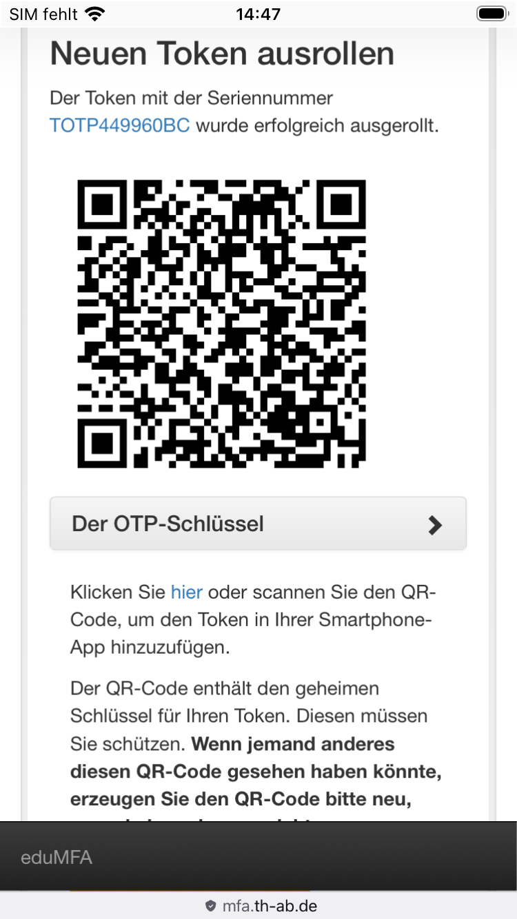 Jetzt können Sie auf den blauen "hier" Button klicken und werden direkt in die Passwörter App weitergeleitet.Alternativ wenn Sie die mfa.th-ab.de Seite auf einem anderen Gerät außer Ihrem Handy geöffnet haben, können Sie den QR-Code mit der Kamera Ihres Handys scannen und speichern es dann in die Passwörter App.