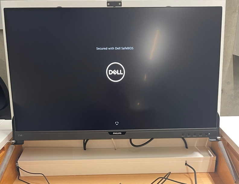 Der ThinClient befindet sich unter dem Tisch, drücken Sie zum Starten auf die Power Taste.