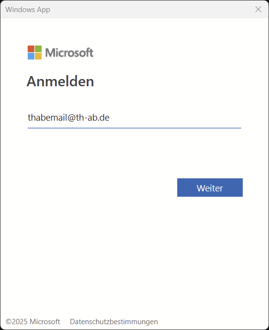Geben Sie ihre THAB E-Mailadresse ein und klicken Sie auf Weiter