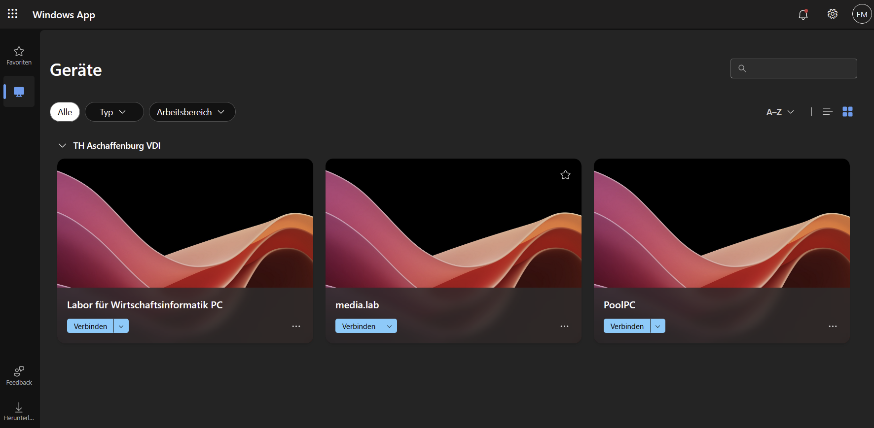 Klicken SIe beim gewünschten virtuellen PC auf Verbinden