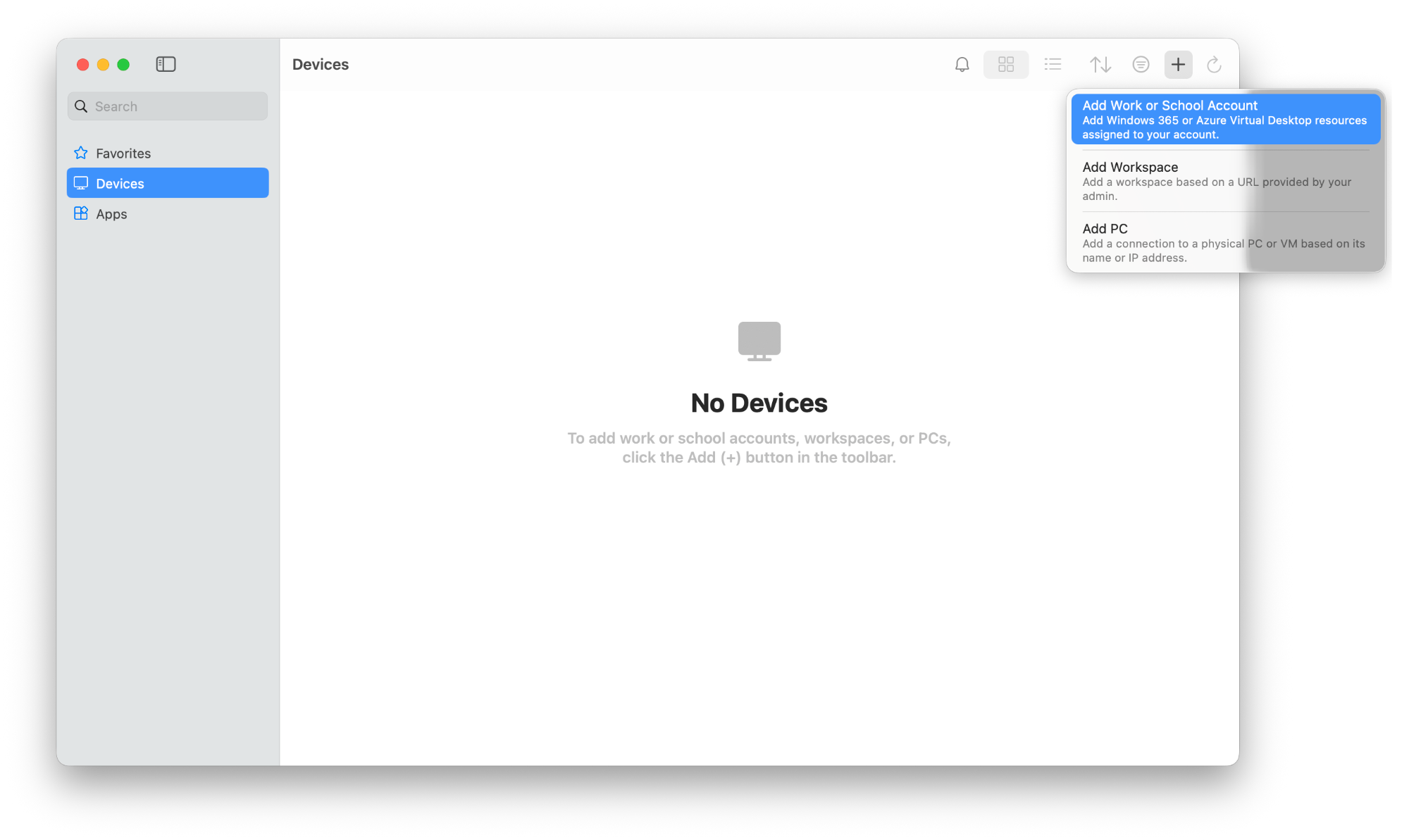 Klicken Sie auf das + und wählen Sie "Add Work or School Account"