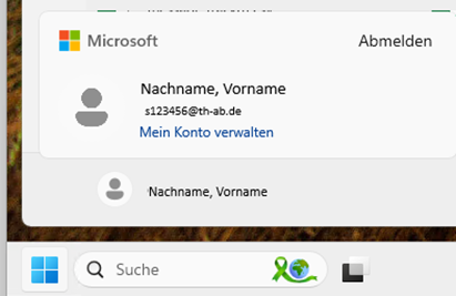 Sobald Ihre Arbeit abgeschlossen ist, melden sie sich am virtuellen Rechner ab, in dem Sie das Startmenü öffnen, auf ihren Namen klicken und Abmelden auswählen.